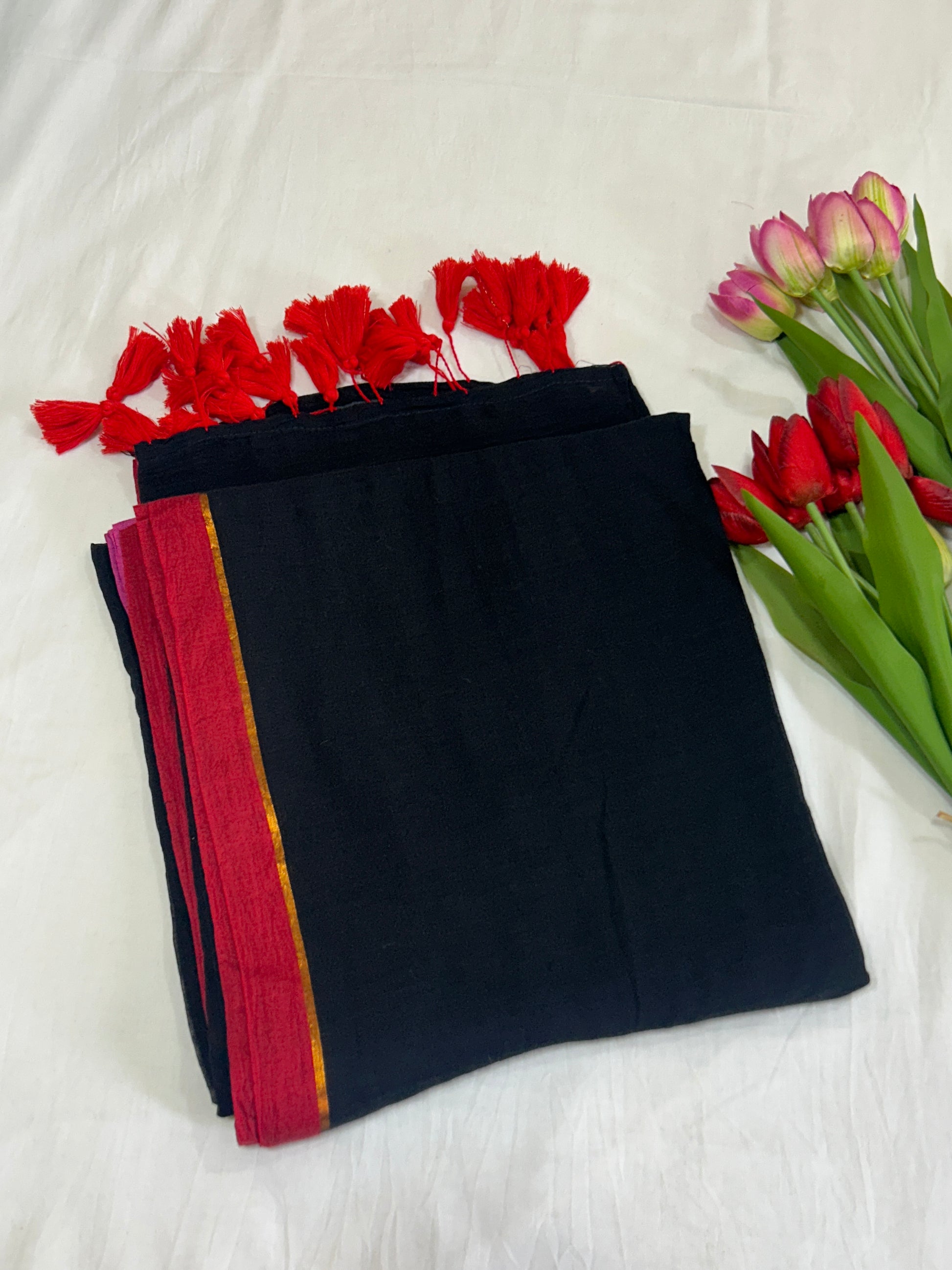 Plain black mulcotton saree with red color border with golden stripe on one side and pink color border with golden stripe on the other side. Pallu has red tassles. No blouse piece