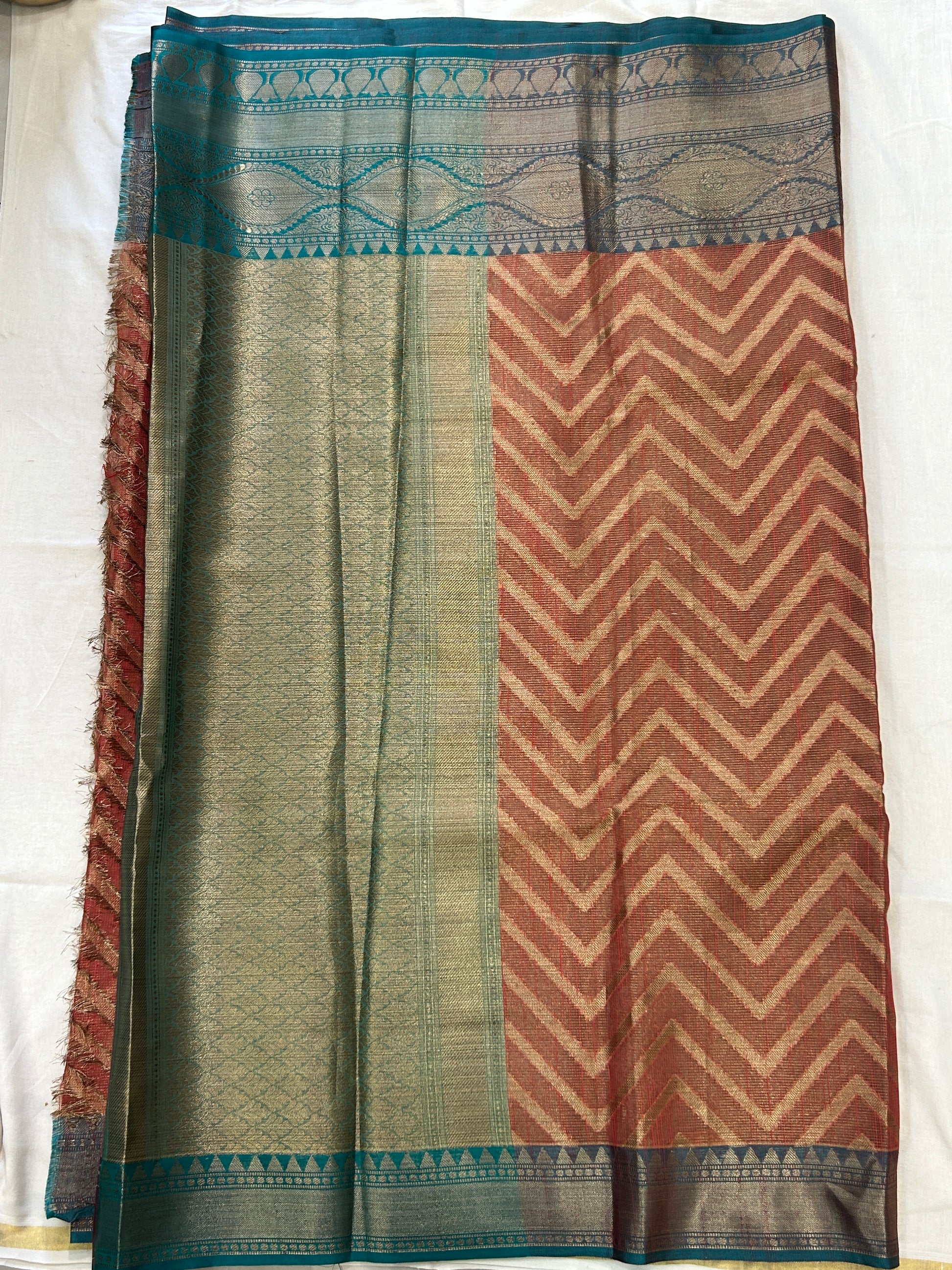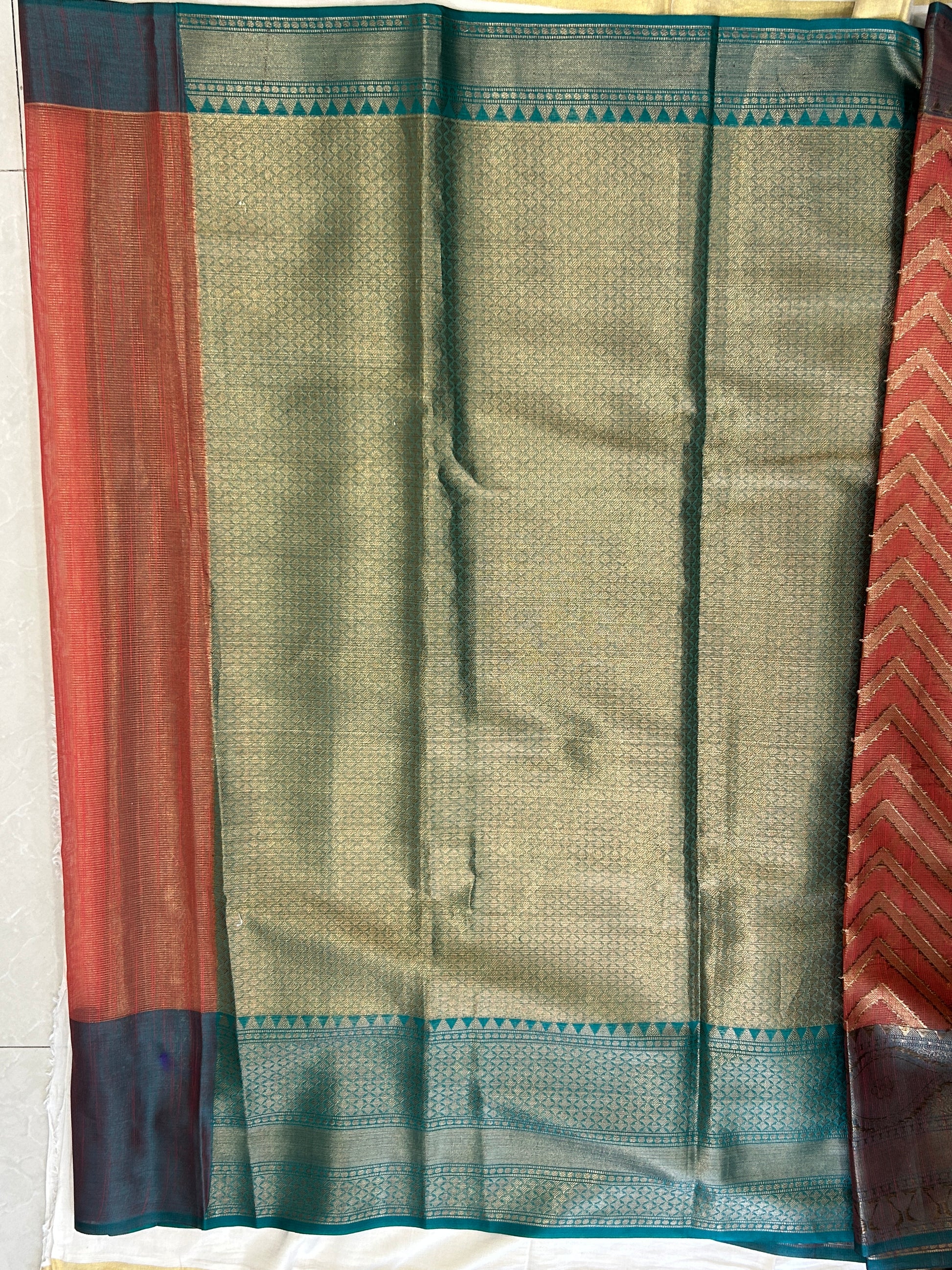 Burnt Orange with Teal blue border with Antique Gold Zari Linen Tissue Banarasi saree with Brocade blouse piece