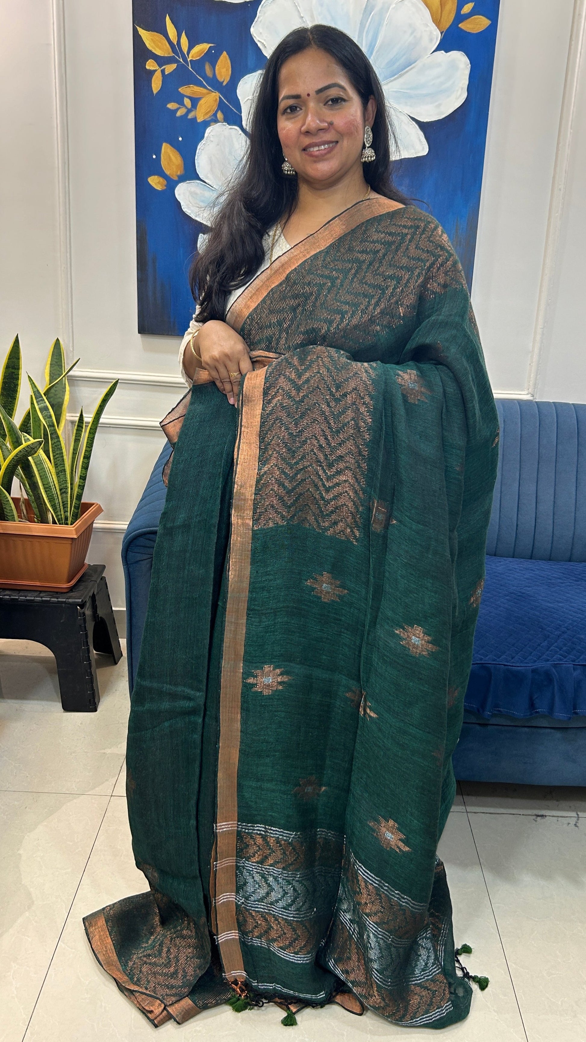 Dark Green Linen Ikat Weave border Pure Handloom Saree with Blouse Piece SLN34