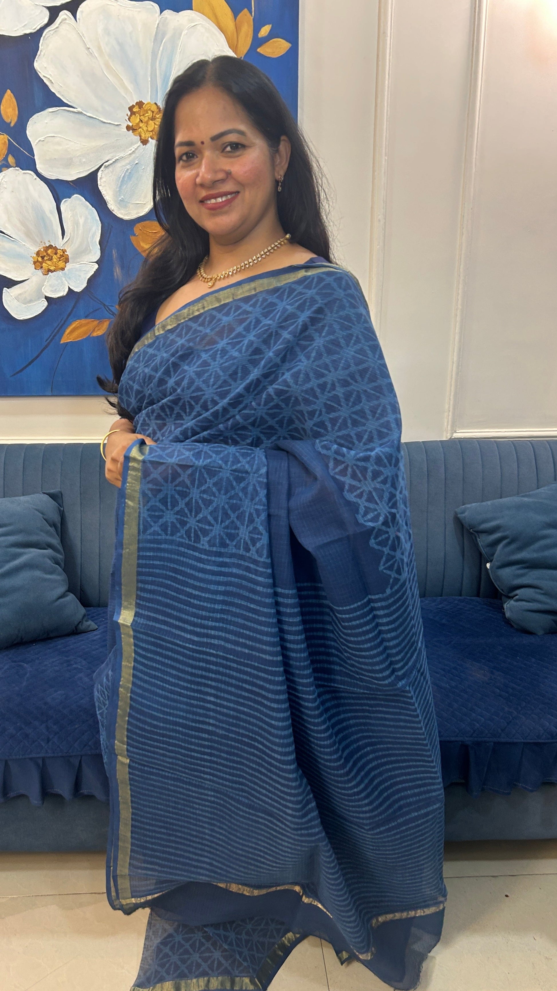 Indigo Kota Doriya Hand Block print Sarees with Blouse Piece SKT139