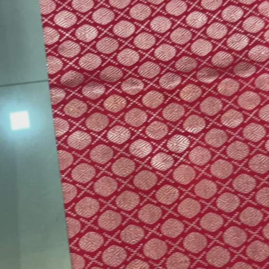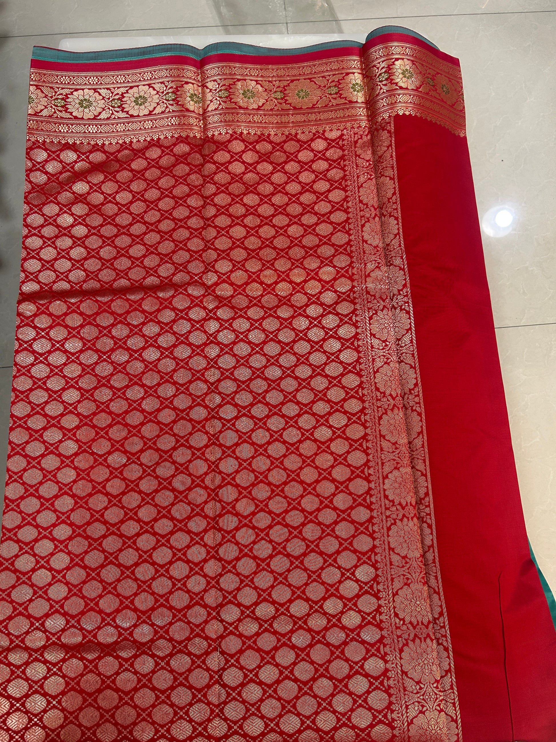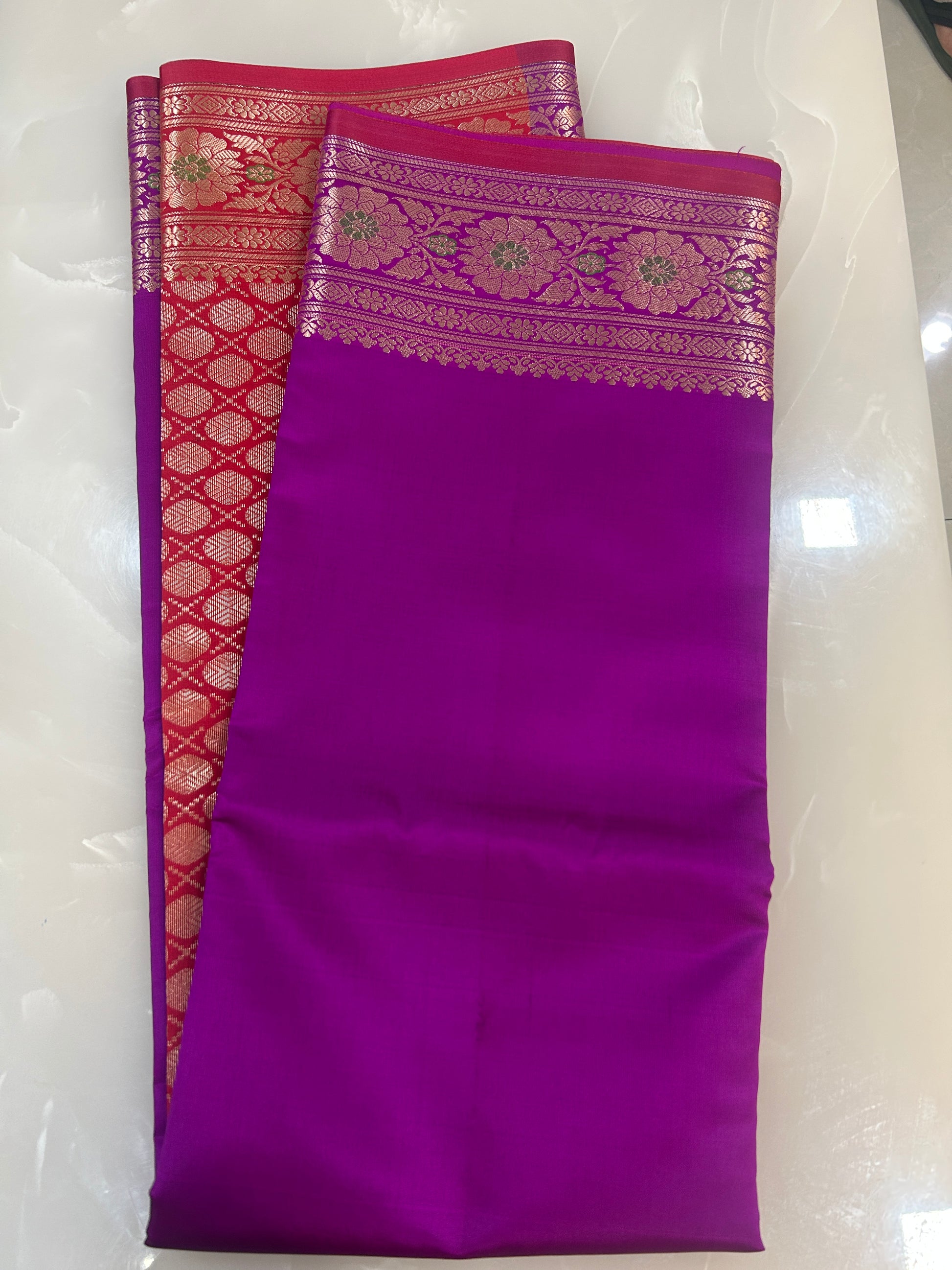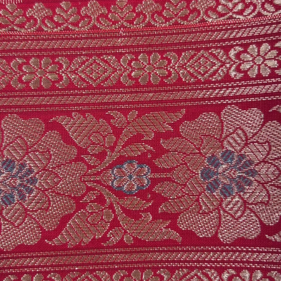 Available in 3 color options Purple, Teal green and Royal Blue. Body is plain with contrast red rich brocade pallu with zari woven floral borders. Blouse also in plain red color with round golden butta weaving and wide borders with zari woven floral borders.