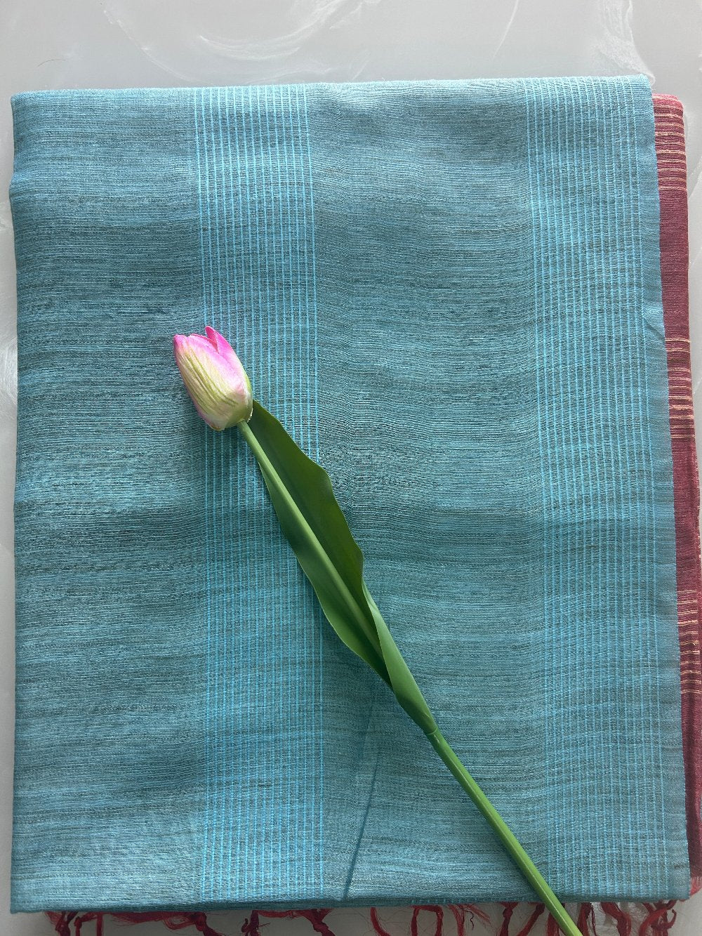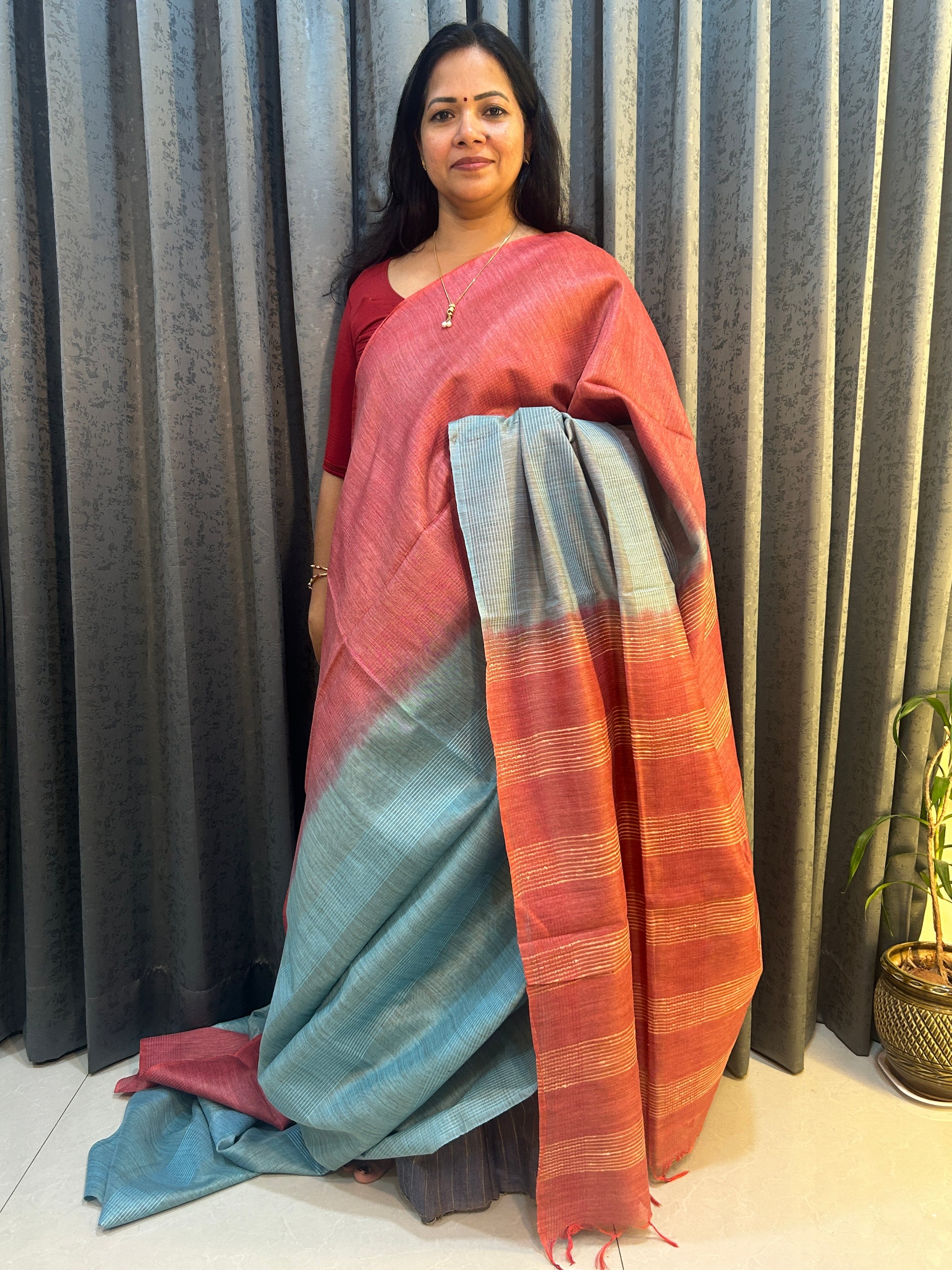 Light blue and brick red shaded 8 lines shaded Art tusser silk saree