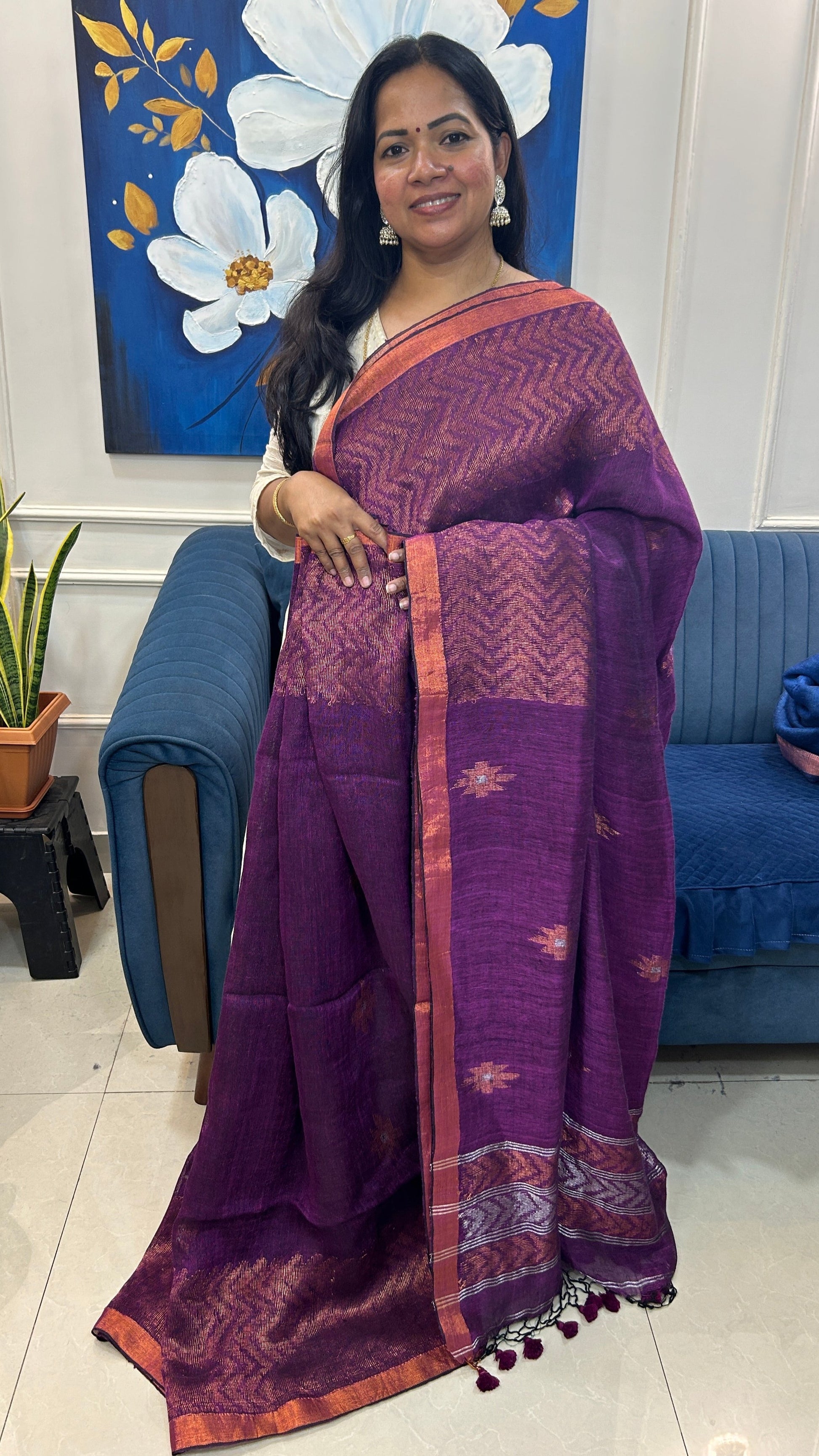 Purple Linen Ikat Weave border Pure Handloom Saree with Blouse Piece SLN35