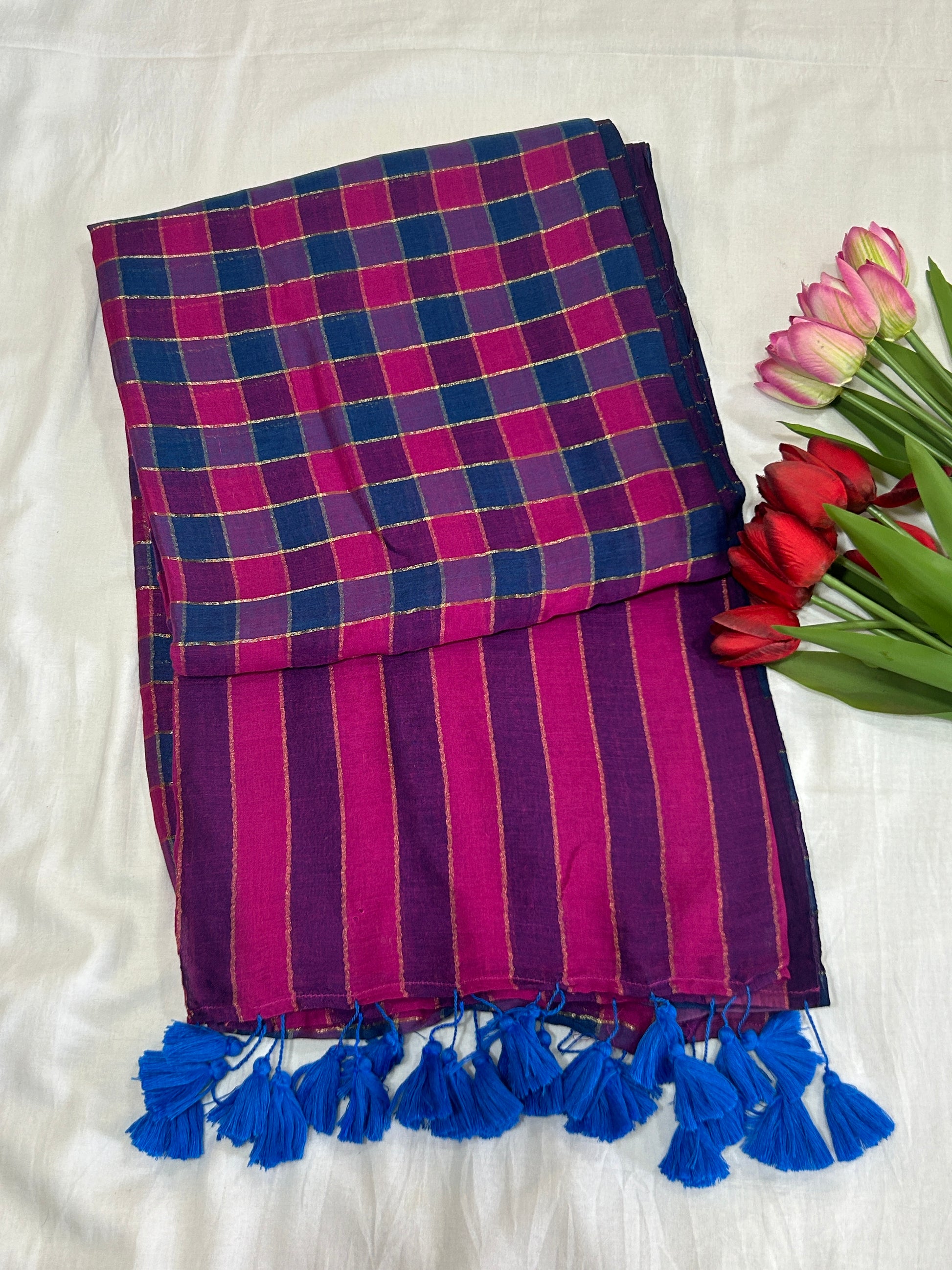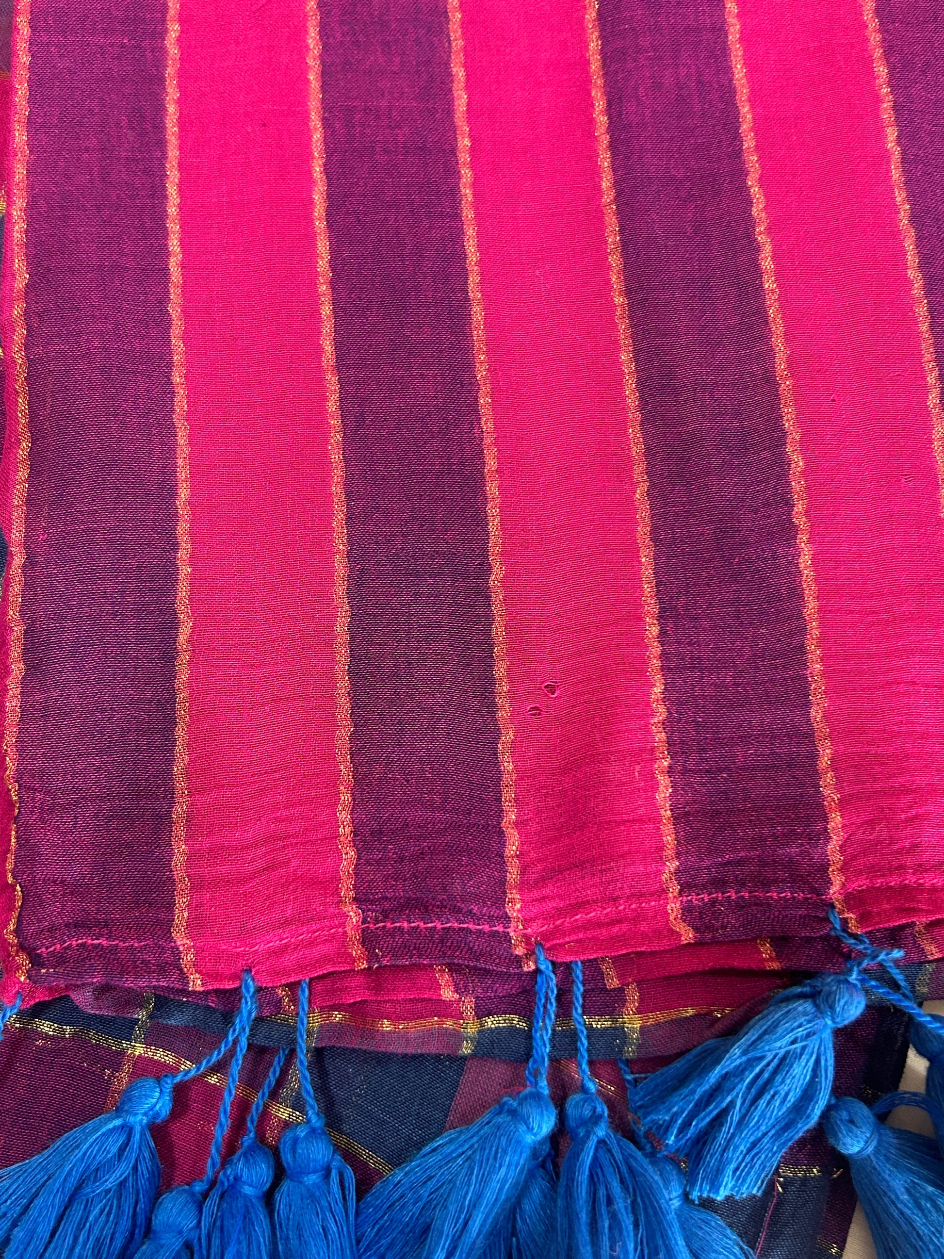 Mulcotton saree with majenta and purple stripe pallu with blue bright tassels . Body features a magenta and teal blue checked pattern accented with fine gold lines. No bouse piece