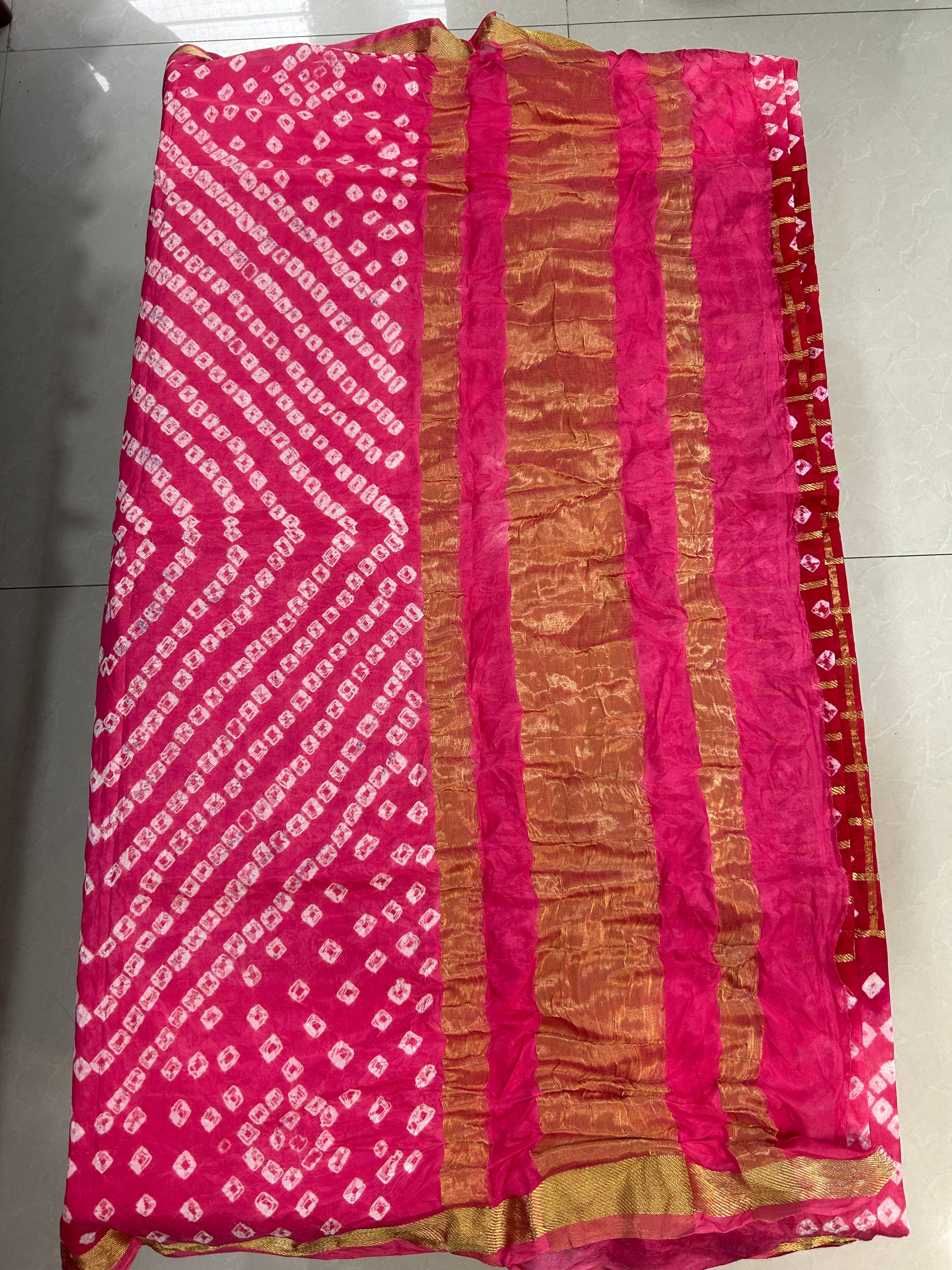 Celebrate timeless artistry with this elegant Bandhani saree in a Red and pink palette. Crafted on lightweight fabric, the saree features traditional white Bandhani dot patterns arranged in symmetrical diagonal lines and checkered motifs. The highlight is the luxurious golden zari border and pallu, which adds a regal touch to its rustic charm.