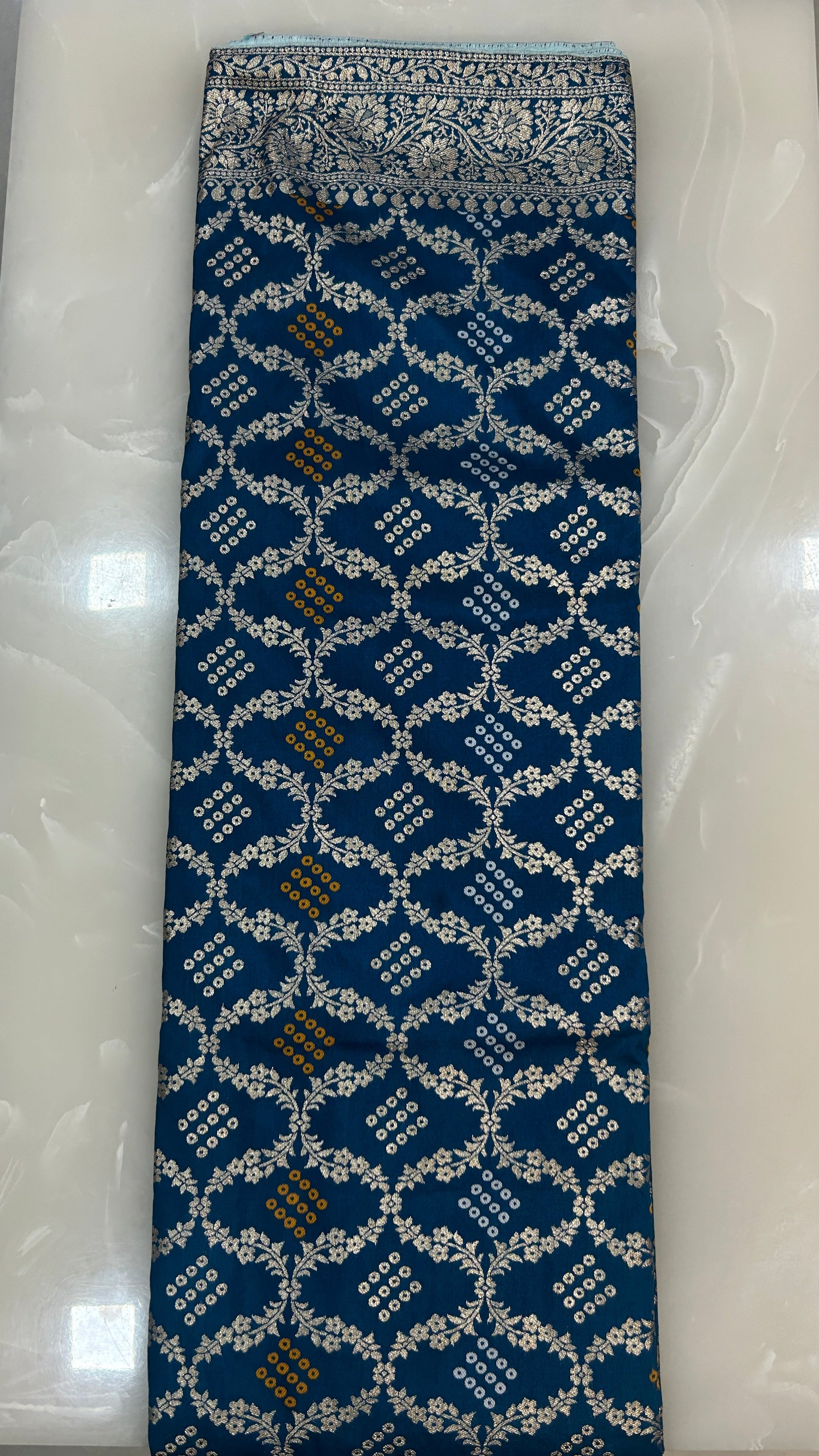 Wrap yourself in timeless elegance with our Teal Blue Bandhani Banarasi Saree is a stunning blend of Gujarat’s traditional Bandhani art and the intricate craftsmanship of Banaras.