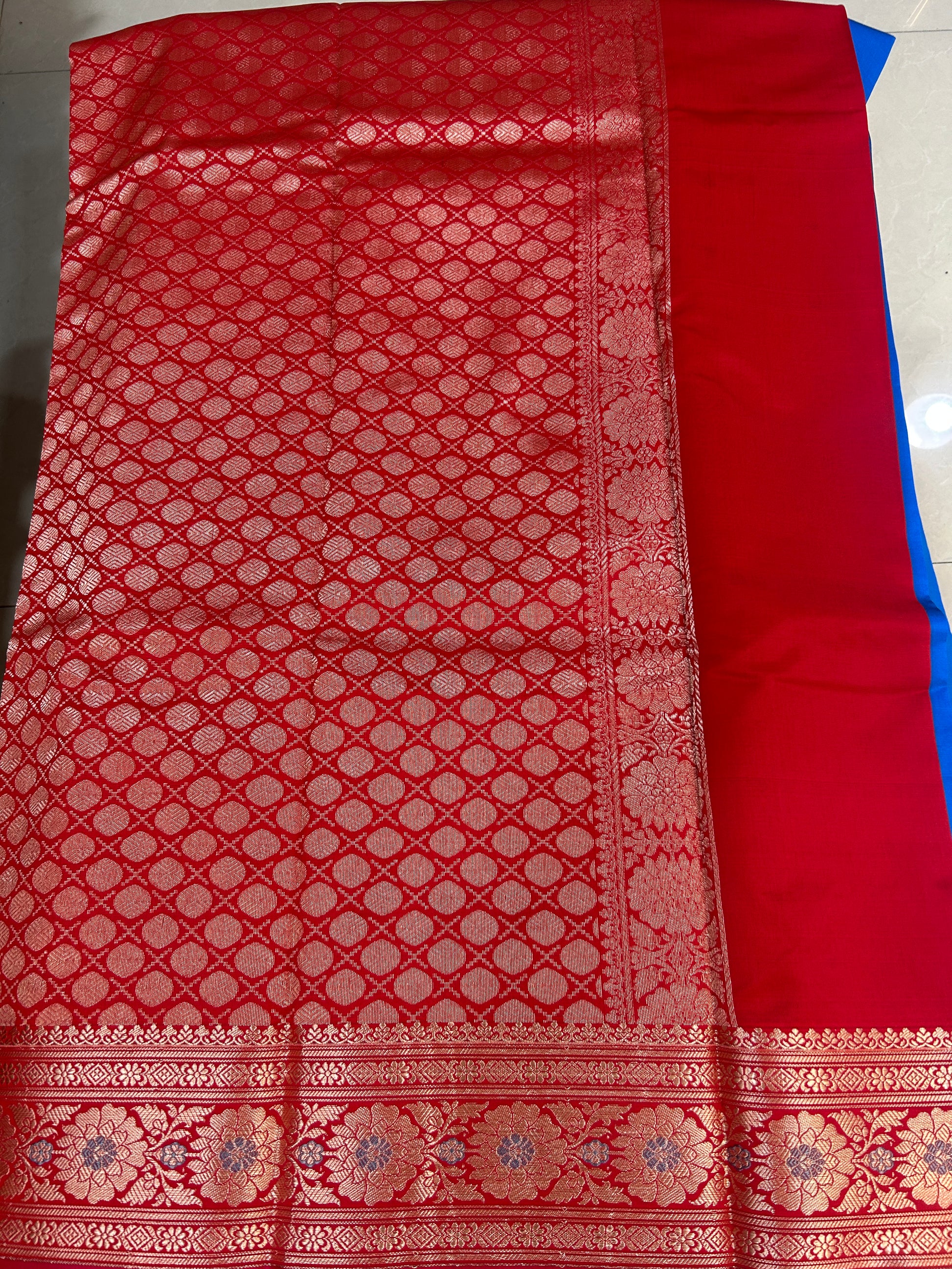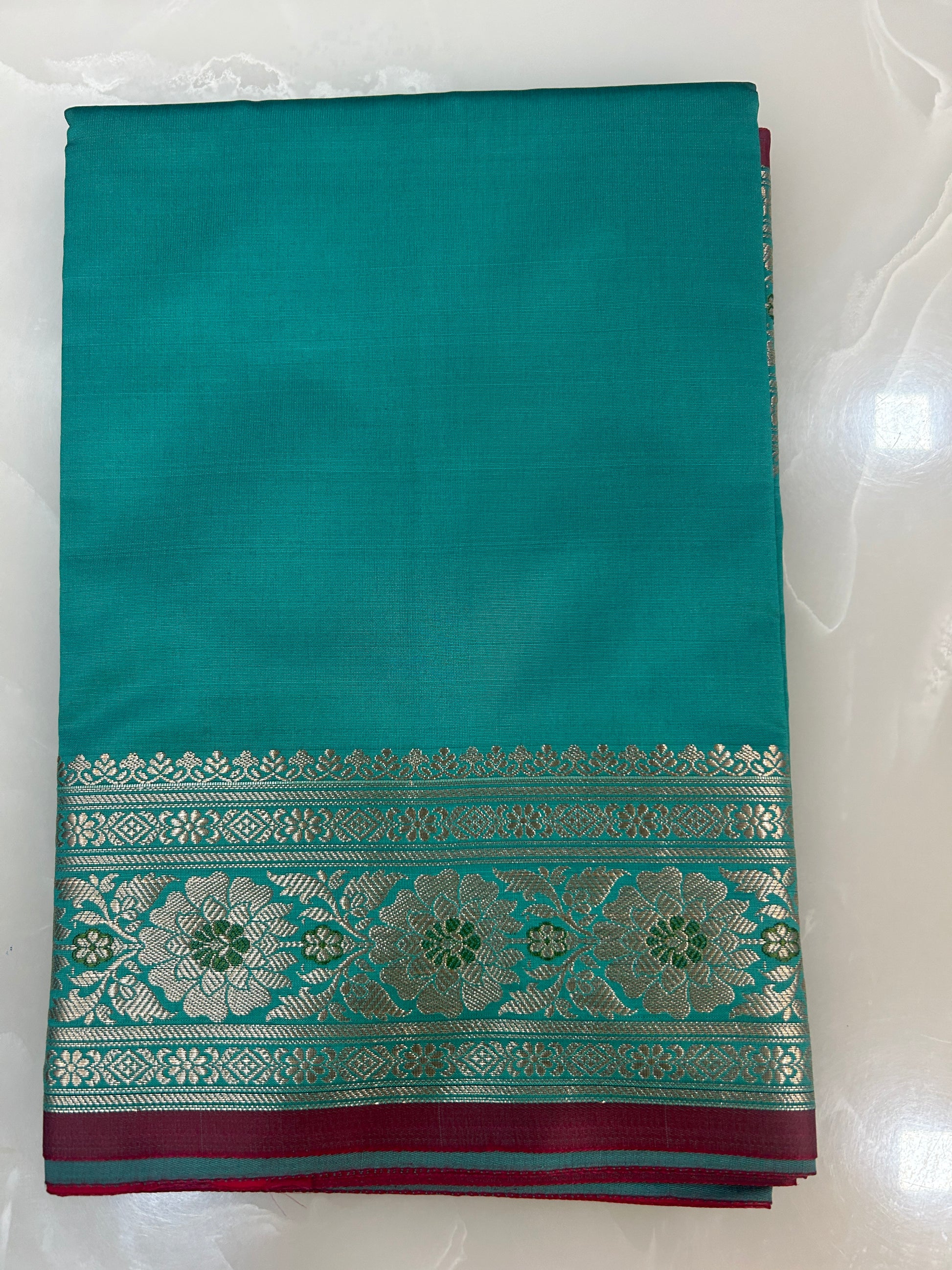 Available in 3 color options Purple, Teal green and Royal Blue. Body is plain with contrast red rich brocade pallu with zari woven floral borders. Blouse also in plain red color with round golden butta weaving and wide borders with zari woven floral borders.
