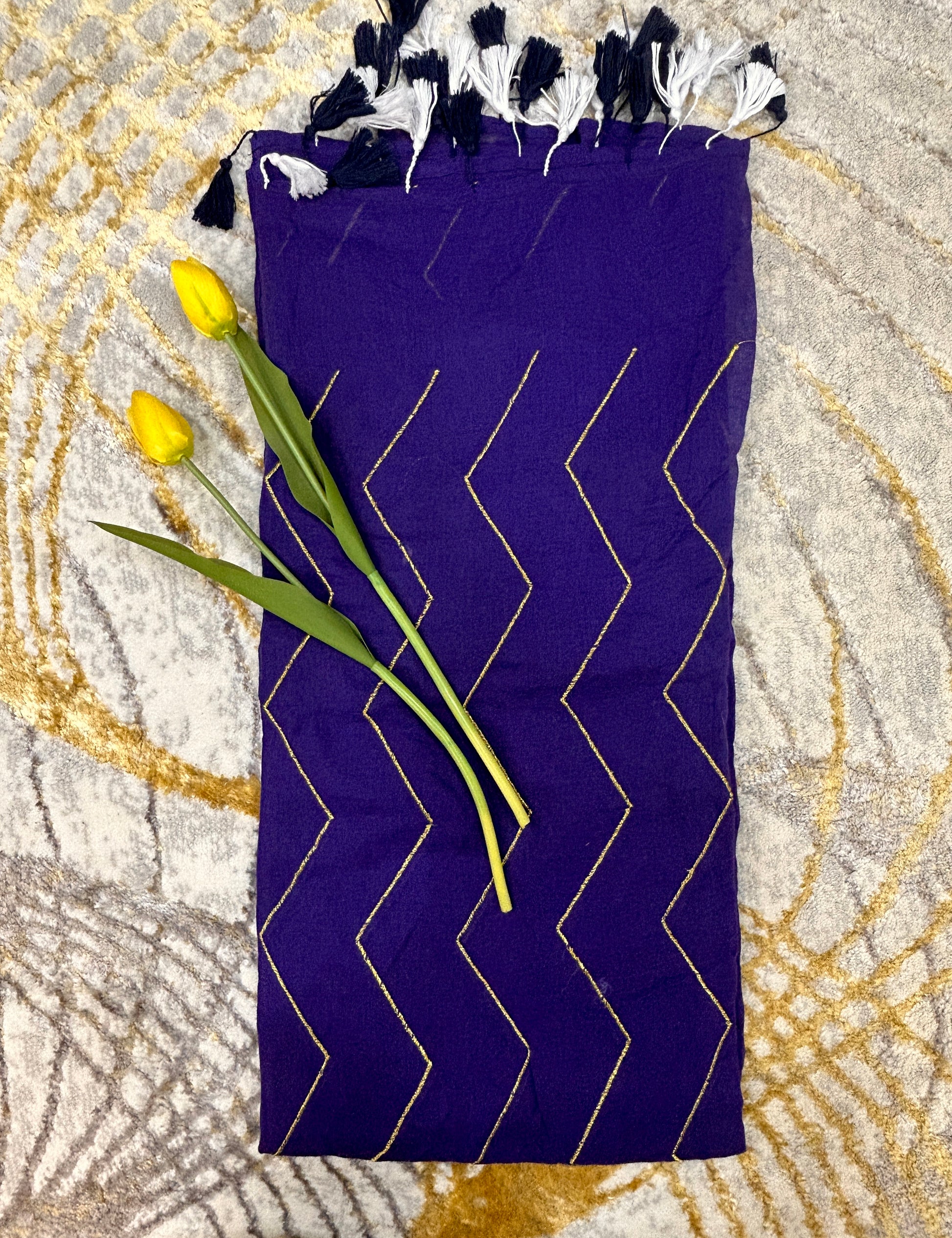Violet color mulcotton saree with zig zag golden tread embroidery all over the body and pallu. Tassels at the end of Pallu. Fabric is mulmul cotton.