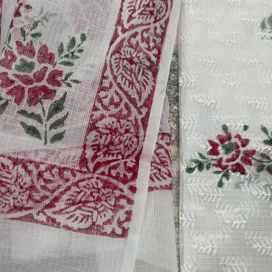 White and red color printed Kota Doria 3 piece unstitched Dress Material