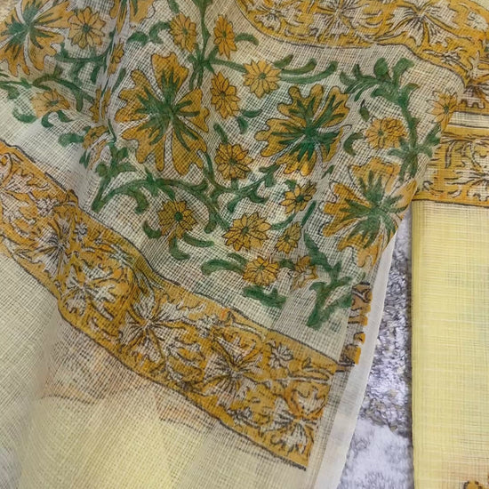 - Top: 2.5m Yellow Kota Doria with floral print in green and mustard tones